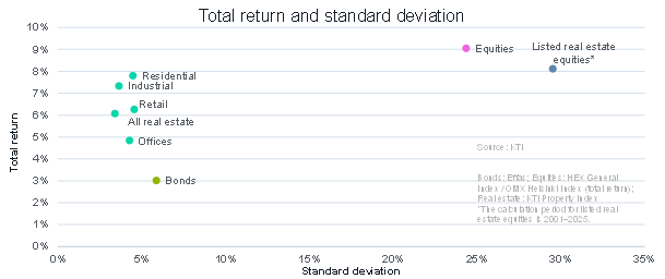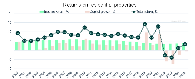 Total return on residential real estate rose to 3.3% (2024: 1.2%). The level remains low compared with the long-term average of around 7.2% over the past 20 years. However, last year’s result was the strongest for residential portfolios since 2021, when total returns stood at 12.9%. Despite the still subdued return level, the gradual market recovery has supported improving investor sentiment.