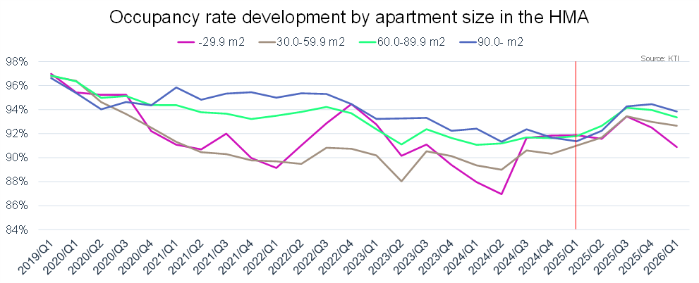 Over the past two years, average household size has started to increase after a long decline. This shift in housing trends is visible in the market. In Q1’26, the occupancy rate in the HMA was approximately 1.5 percentage points higher than a year earlier. The increase is mainly driven by larger rental apartments. In units over 90 m², occupancy rates rose by 2.5 percentage points year-on-year, while the 30–89.9 m² segment also saw a solid increase. The exception is apartments under 30 m², where occupancy rates in the HMA declined by one percentage point from a year earlier.