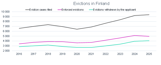 According to the National Enforcement Authority Finland’s statistics, the number of evictions has increased annually since the post-pandemic years. Last year, the trend already appeared to be levelling off, but developments towards the end of the year pushed the figure to a new record. On a positive note, the National Enforcement Authority Finland reports that in an increasing number of cases, eviction applications were withdrawn as tenants moved out voluntarily.