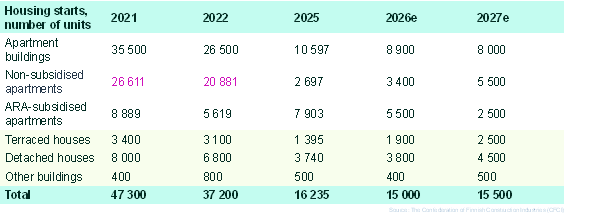 The Confederation of Finnish Construction Industries (CFCI) has significantly revised down its forecast for housing starts this year. Housing construction is now expected to decline by 3%, compared with an earlier projection of a 12% increase for 2026. The number of starts is forecast to fall to around 15,000 units (2025: 16,200), down from a previous estimate of roughly 20,000. According to CFCI, the risk of weaker-than-expected development remains substantial. Overall, housing production has fallen to levels last seen in the 1950s, which CFCI considers insufficient to meet the needs of urbanisation. This year will mark the fourth consecutive year in which housing production remains clearly below 20,000 units.